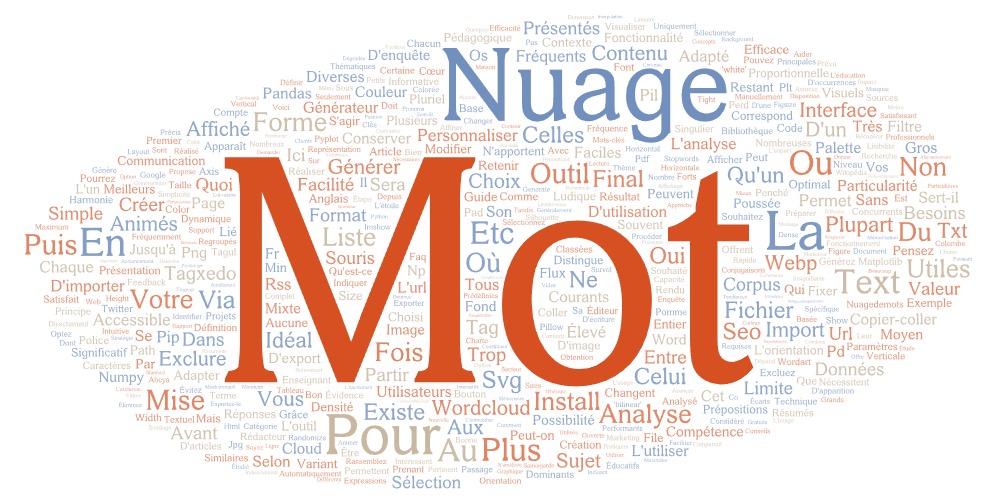 Créer un nuage de mots : quels outils ? Web by Nuage - avril 28, 2025février 26, 20260 A retenir Les nuages de mots permettent de visualiser les termes les plus fréquents d’un texte en variant leur taille proportionnellement à leur importance Il existe de nombreux outils gratuits en ligne comme Nuagedemots.co, WordArt ou ABCya qui ne nécessitent aucune compétence technique Les nuages de mots sont particulièrement utiles pour l’analyse de contenu, les présentations visuelles et la mise en évidence des concepts clés Pour un résultat optimal, pensez à filtrer les mots vides (articles, pronoms) et à personnaliser les couleurs, polices et formes Python offre des options avancées de création via la bibliothèque wordcloud pour les utilisateurs plus techniques Qu’est-ce qu’un nuage de mots et à quoi sert-il ? Un nuage de mots (ou tag cloud en anglais) est une représentation visuelle des mots les plus fréquemment utilisés dans un texte. Plus un mot apparaît souvent dans le document analysé, plus il sera affiché en gros caractères dans le nuage. Cette technique permet de mettre en évidence rapidement les termes dominants et les thématiques principales d’un contenu. Le principe de fonctionnement est simple : l’outil analyse un corpus de texte, filtre les mots vides (articles, pronoms, etc.) pour ne conserver que le contenu pertinent, puis compte le nombre d’occurrences de chaque terme restant. Les mots et expressions similaires sont généralement regroupés (singulier/pluriel, conjugaisons) et chaque mot est affiché dans une taille proportionnelle à sa fréquence d’apparition. Utilisations courantes des nuages de mots : Analyse de contenu et de données textuelles Présentations visuelles et supports pédagogiques Résumés graphiques d’articles ou de documents Mise en évidence des concepts clés d’un sujet Supports marketing et communication visuelle Analyse de feedback et d’enquêtes clients Comment créer un nuage de mots : étape par étape La création d’un nuage de mots est accessible à tous, même sans compétences techniques particulières. Voici un guide étape par étape pour réaliser votre premier nuage de mots : 1. Choisir un outil adapté De nombreux outils en ligne gratuits permettent de créer des nuages de mots. Sélectionnez celui qui correspond le mieux à vos besoins en termes de fonctionnalités, de personnalisation et de facilité d’utilisation. 2. Préparer votre texte Rassemblez le texte que vous souhaitez analyser. Il peut s’agir d’un article, d’un document, de réponses à une enquête, ou même du contenu d’une page web. 3. Importer le texte Selon l’outil choisi, vous pourrez : Copier-coller directement votre texte Importer un fichier (Word, PDF, TXT) Indiquer l’URL d’une page web à analyser 4. Personnaliser votre nuage La plupart des outils offrent diverses options de personnalisation : Choix des couleurs et du fond Sélection de la police Définition d’une forme spécifique pour le nuage Orientation des mots (horizontale, verticale, mixte) Nombre maximum de mots à afficher 5. Filtrer les mots non pertinents Pour un résultat plus significatif, excluez les mots courants ou insignifiants qui n’apportent pas de valeur à l’analyse (articles, prépositions, etc.). 6. Générer et exporter Une fois satisfait du résultat, générez votre nuage final et exportez-le dans le format souhaité (PNG, JPG, WebP, SVG) pour l’utiliser dans vos documents ou présentations. Les meilleurs outils pour créer des nuages de mots Il existe de nombreux générateurs de nuages de mots, chacun avec ses particularités. Voici une sélection des outils les plus performants et faciles à utiliser : Nuagedemots.co Considéré comme l’un des meilleurs outils gratuits en ligne, Nuagedemots.co se distingue par sa simplicité et son efficacité. Vous pouvez coller un texte entier ou seulement les mots-clés qui vous intéressent, puis personnaliser l’orientation et la forme du nuage avant de sélectionner la police et la couleur. L’outil permet d’exporter le résultat en PNG, JPG ou WebP. > Google Lens en ligne : guide pour tout reconnaître, traduire et rechercher sur le webWordArt (anciennement Tagul) WordArt est un générateur très complet qui permet une personnalisation poussée. Il offre de nombreuses polices et formes classées par catégorie, et permet même de choisir l’orientation du texte (horizontal, vertical, penché). Sa particularité : la possibilité de créer des nuages animés où les mots changent de taille et de couleur au passage de la souris. ABCya Avec son interface colorée et ludique, ABCya propose un générateur de nuages de mots particulièrement adapté aux projets éducatifs. L’outil permet de fixer facilement une limite de mots, changer la disposition du texte, et modifier les couleurs et la police d’écriture. Un bouton « Randomize » permet de modifier aléatoirement le nuage jusqu’à obtention d’un résultat satisfaisant. Tagxedo Tagxedo se distingue par sa capacité à créer des nuages de mots prenant la forme d’une silhouette d’image. L’outil permet d’importer du contenu depuis diverses sources (URL, identifiant Twitter, recherche Google, flux RSS) et propose plusieurs formes prédéfinies comme la pomme, la colombe, le cœur ou l’étoile. HTML5 WordCloud Réalisé en HTML5, cet éditeur génère des nuages très graphiques et dynamiques. Vous pouvez copier-coller un texte ou demander à l’outil de récupérer automatiquement un article sur Wikipédia ou le contenu d’un fichier texte. Tableau comparatif des outils de création de nuages de mots Outil Niveau de personnalisation Formats d’export Particularités Facilité d’utilisation Nuagedemots.co Élevé PNG, JPG, WebP Interface intuitive, rapide ★★★★★ WordArt Très élevé PNG, JPG, SVG, PDF Nuages animés, nombreuses formes ★★★★☆ ABCya Moyen PNG Interface ludique, idéal pou
